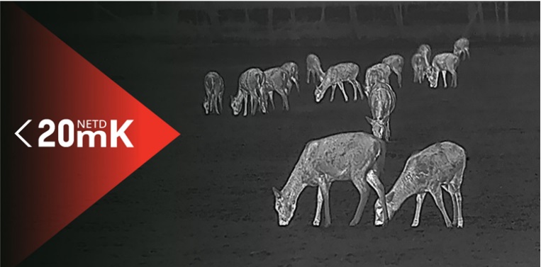 Тепловизионный модуль построен на базе неохлаждаемого микроболометра VOx Uncooled Focal Plane Arrays по технологиям с плотностью размещение детекторов 12 мкм. Матрица фокальной плоскости (FPA) с размером монокристалла 384x288 имеет крайне высокий порог тепловой чувствительности NETD на уровне <20 mK, позволяя различать минимальные колебания температуры. Ик-модуль функционирует в области спектра электромагнитного излучения от 8 до 14μm, что соответствует требованиям для обнаружения излучения от объектов в длинноволновой инфракрасной части спектра LWIR. Земная атмосфера в этой части спектра полностью «прозрачна» и не создает помех для прохождения сигналов, в результате чего, тепловизоры могут видеть как в полной темноте, так и сквозь преграды в виде тумана, дыма, осадков. Частота обновления кадров 50 Гц.