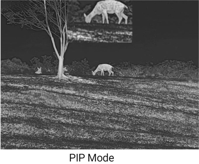 Активация функции PiP отображает дополнительное окно на главном экране, которое показывает увеличенный фрагмент центральной зоны основного изображения. Эта функция значительно упрощает процесс опознавания и идентификации животных, при этом компактные размеры вспомогательного окна не мешают обзору, обеспечивая полный контроль за окружающей обстановкой.